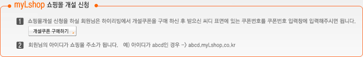 ● 몰운영자는 몰을 임대한후 매월발생하는 몰 호스팅비용(6개월, 12개월)의 단위상품을 구매하여쿠폰번호를 입력함으로써